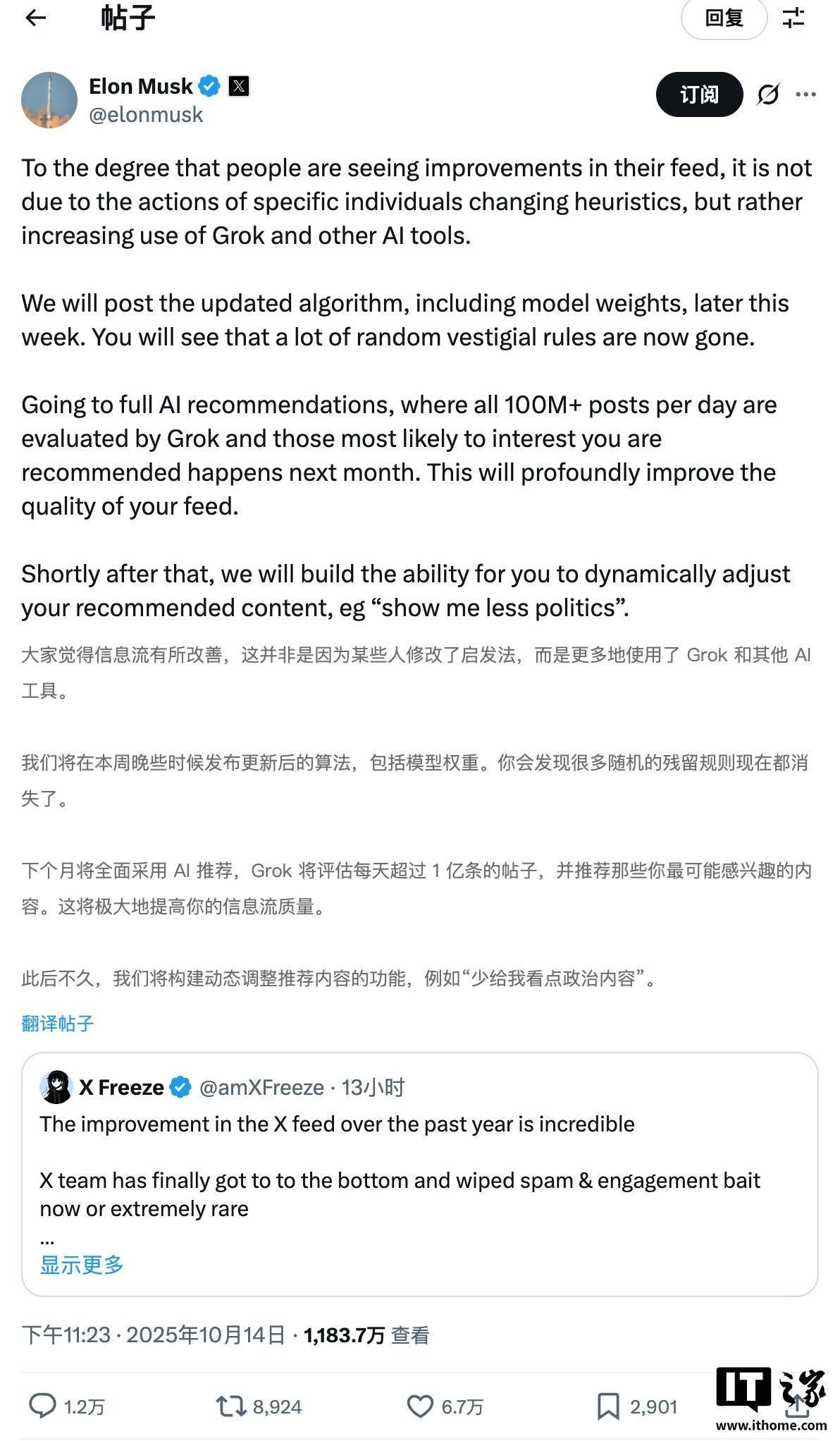 并保举那些最有可能让用户感乐趣的内容,查看更多马斯克是正在转发一则帖子时做出上述的。用户能够提出“少给我推点内容”等需求。X 的保举算法正正在被轻量版 Grok 所代替。马斯克进一步说,马斯克就曾透露,马斯克正在 X 平台发文颁布发表,
