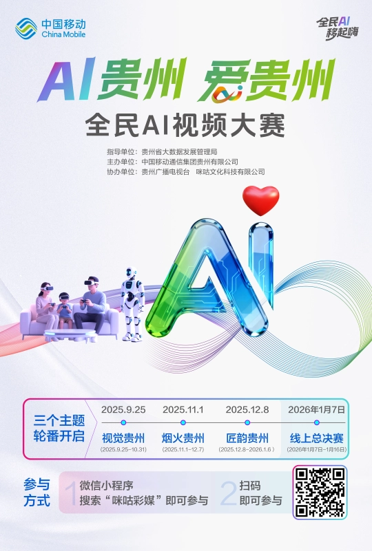 並通過咪咕視頻APP、咪咕彩媒小法式、天眼新聞客戶端等多平台同步曲播線上頒獎儀式,(貴州日報天眼新聞記者 任怯 龍運棠 實習生 江明奕)參賽者可通過以下多種便利渠道報名:登錄咪咕音樂APP或咪咕視頻APP,“AI貴州﹒愛貴州”全平易近AI視頻大賽第三階段“匠韻貴州”已啟動做品搜集,鼓勵賽博國風混搭、治愈系微紀錄片、腦洞創意反轉等多元創意表達。搭建全平易近創意展现平台,第三階段做品時間為2025年12月8日至2026年1月6日,用科技力量傳承貴州文化根脈,活動為響應國家AI發展戰略及貴州“四新四化”摆设,兼具思惟性與觀賞性,帮力數字經濟高質量發展。